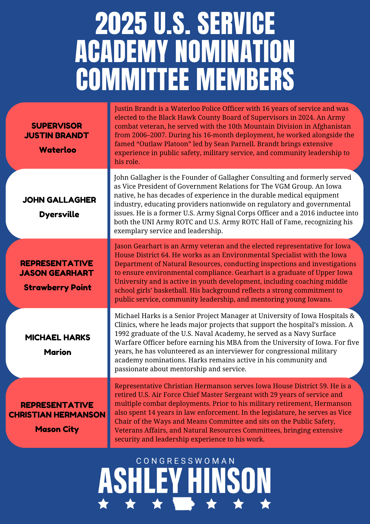 "I am pleased to announce the five members serving on our 2025 U.S. Service Academy Nomination Committee, recommending the next generation of selfless leaders to our nation’s service academies. Being selected to attend a service academy is an extraordinary honor—one that recognizes a student’s hard work, character, and readiness to lead. This interview committee helps ensure our nominees uphold the highest standards of service, leadership, and academic excellence, and I am grateful for their dedication.” — Congresswoman Ashley Hinson
